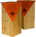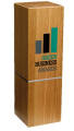 Trofeo in legno sagomato incorniciato da fascia in metallo.