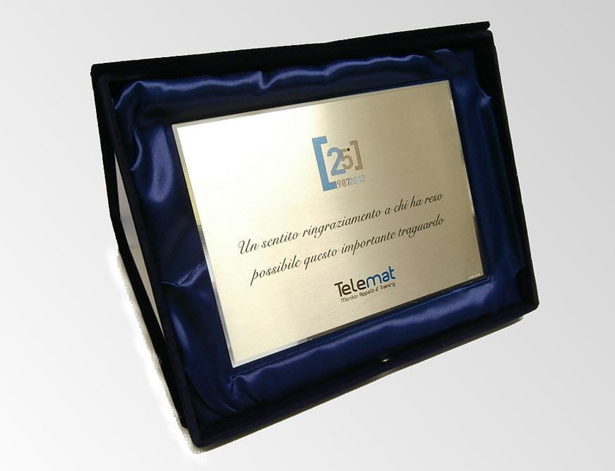targa in alluminio stampata, astuccio velluto